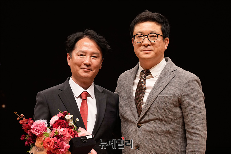 강명일 MBC노동조합(제3노조) 비상대책위원장이 7일 오후 서울 여의도 KBS 아트홀에서 열린 '제2회 대한민국 언론인 대상'에서 수상소감을 밝히고 있다.