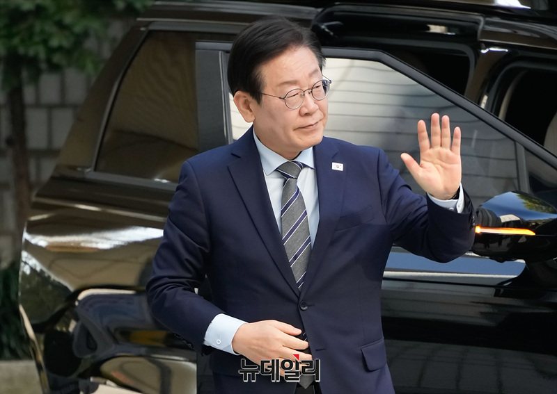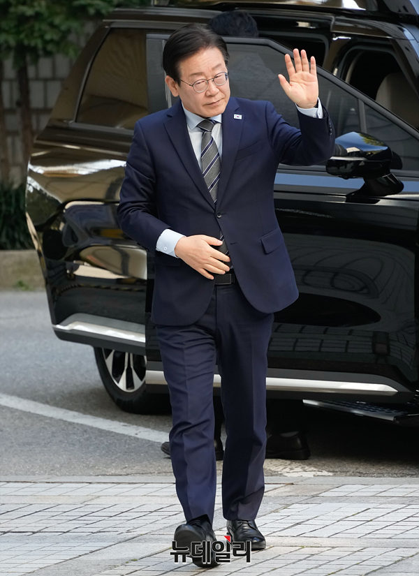 이재명 더불어민주당 대표가 8일 오전 서울 서초구 서울중앙지법에서 열린 '대장동 배임·성남FC 뇌물' 관련 공판에 출석하며 지지자들에게 손인사를 하고 있다.