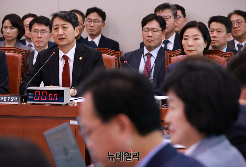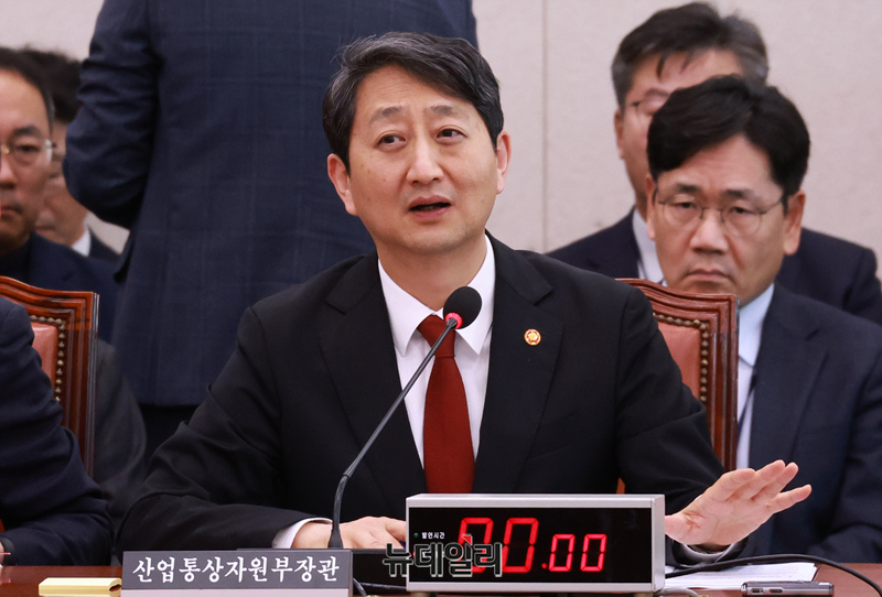 안덕근 산업통상자원부 장관이 12일 오후 국회에서 열린 산업통상자원중소벤처기업위원회 전체회의에서 의원들의 질의에 답하고 있다.