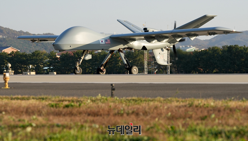 미국 제너럴 아토믹스(General Atomics)에서 개발 중인 고정익 무인기 모하비(Mojave)가 12일 포항 해상에 위치한 해군 독도함에서 실시된 ’대형플랫폼 함정 무인기 운용 전투 실험‘ 에서 비행을 마치고 포항공항으로 착륙하고 있다. (사진=공동취재단)