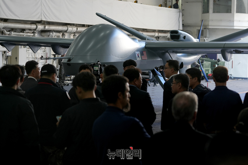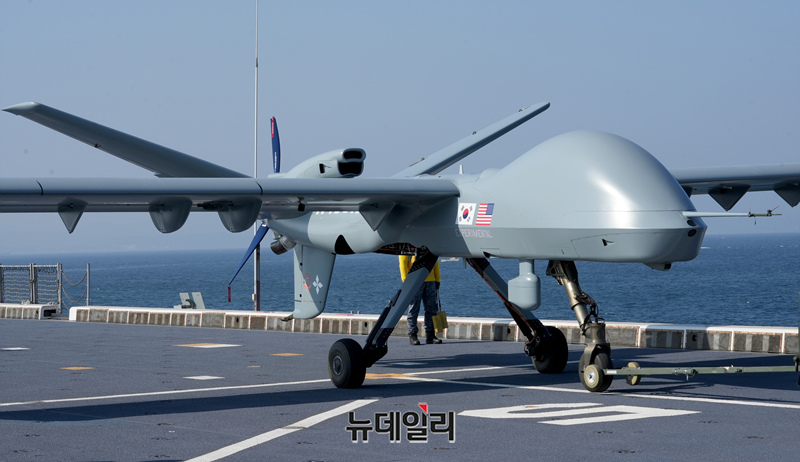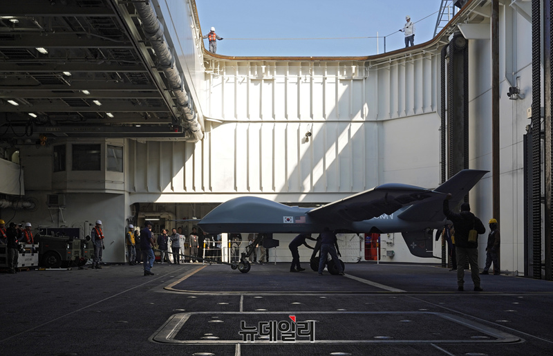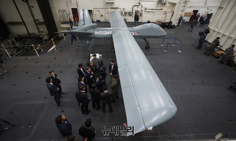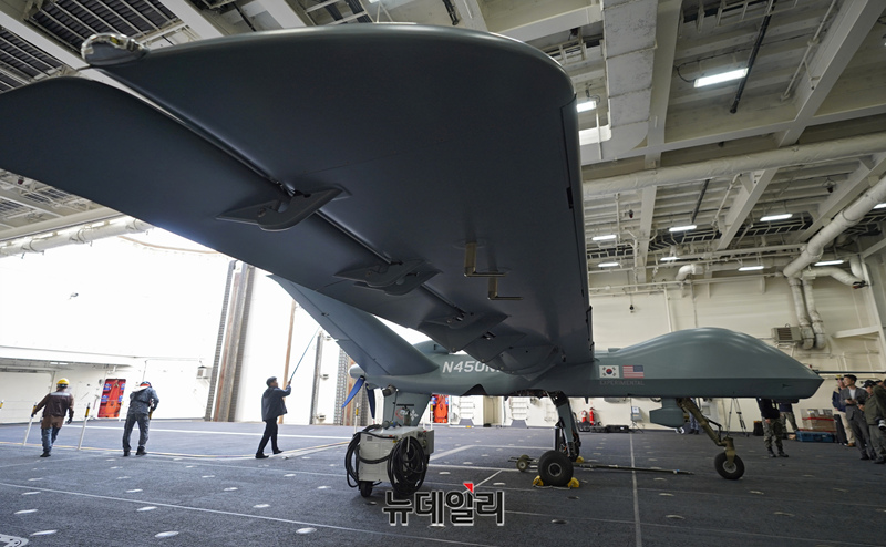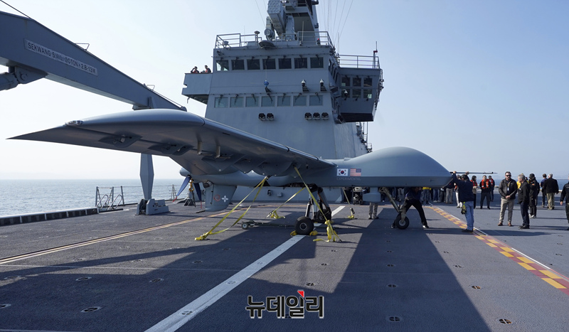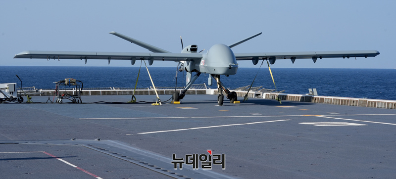미국 제너럴 아토믹스(General Atomics)에서 개발 중인 고정익 무인기 모하비(Mojave)가 12일 포항 해상 해군 독도함에서 실시된 ’대형플랫폼 함정 무인기 운용 전투 실험‘ 에서 이륙을 준비하고 있다. (사진=공동취재단)