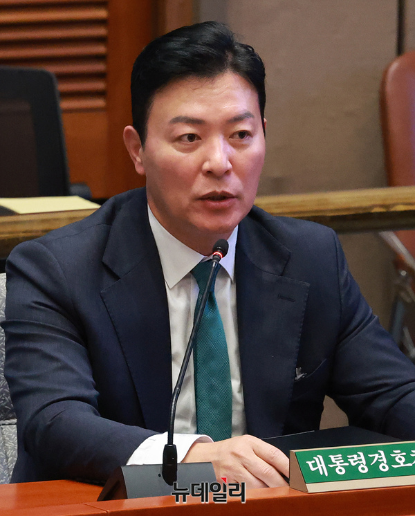 김성훈 대통령경호처 차장이 14일 오전 국회에서 열린 예산결산특별위원회 전체회의에서 의원 질의에 답하고 있다.