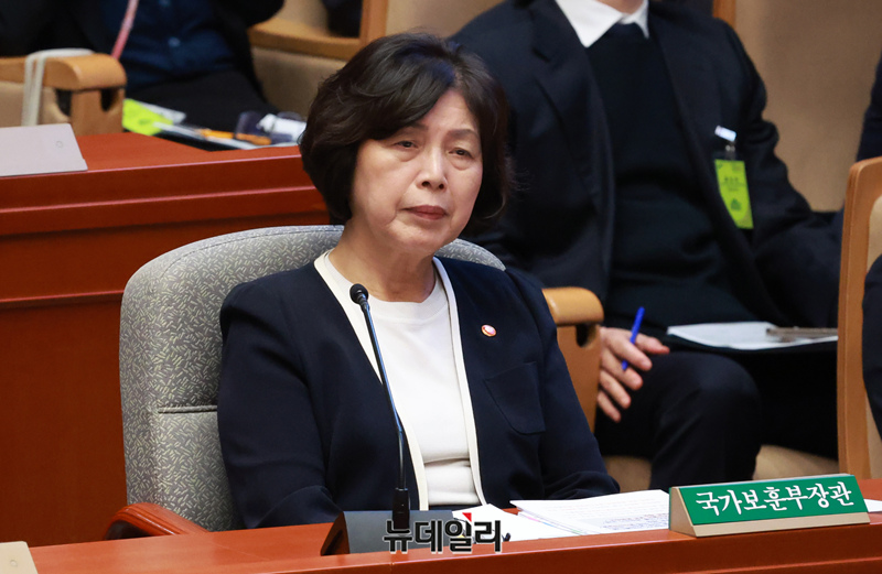 강정애 국가보훈부 장관이 14일 오전 국회에서 열린 예산결산특별위원회 전체회의에서 의원들의 질의를 듣고 있다.