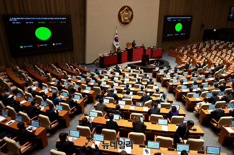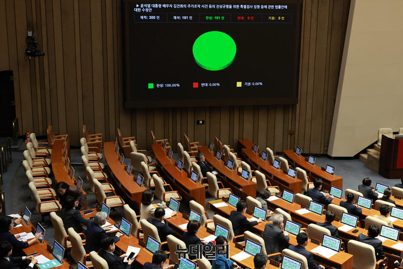 이날 본회의에 김 여사 특검법이 상정되자 반대하는 국민의힘 의원들은 전부 퇴장했고, 더불어민주당을 비롯, 야당 의원 191명이 남아 전원 찬성 표결했다.