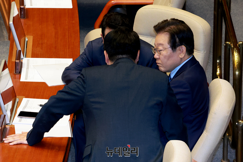 이재명 더불어민주당 대표가 14일 오후 국회 본회의에서 박찬대 원내대표, 박정 국회 예결위원장과 대화를 나누고 있다.