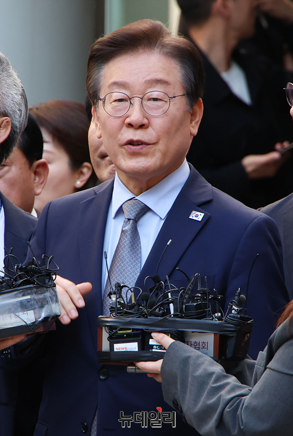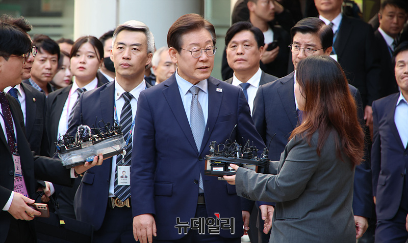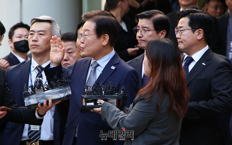 이재명 더불어민주당 대표가 15일 오후 서울 서초구 서울중앙지법에서 열린 '공직선거법 위반' 선고공판을 마치고 법원을 나서며 취재진의 질문에 답하고 있다.