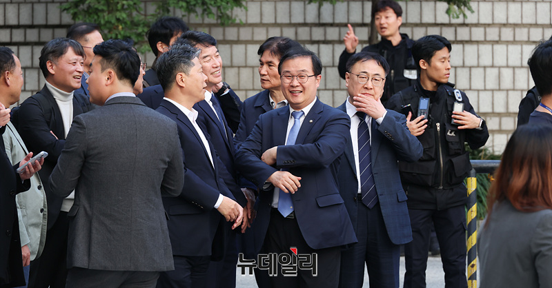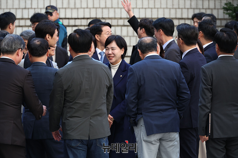 더불어민주당 의원들이 15일 오후 서울 서초구 서울중앙지법에서 열린 '공직선거법 위반' 관련 1심 선고공판에 출석하는 이재명 대표를 기다리고 있다.