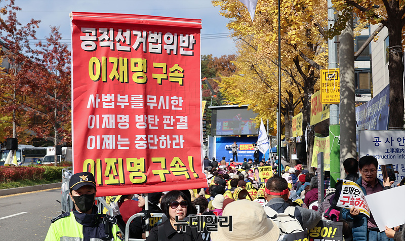 이재명 더불어민주당 대표의 공직선거법 위반 1심 선고공판을 앞둔 15일 오후 서울 서초구 서울중앙지법 앞에서 이재명 대표 구속을 촉구하는 집회가 진행되고 있다.