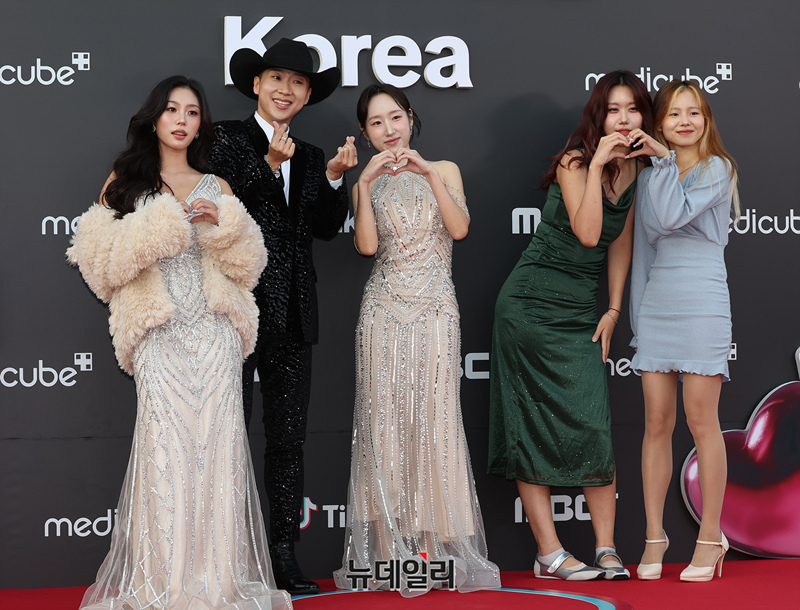 크리에이터 에이미 플래미, 룰루보이, 스위니, 전핑콩, 하봄이 15일 오후 서울 동대문구 경희대학교 평화의 전당에서 열린 '틱톡 어워즈 코리아' 레드카펫행사에 참석해 포즈를 취하고 있다.