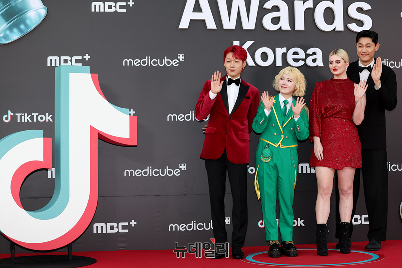 백동욱, 몸치탈출연구소, 진앤해티가 15일 오후 서울 동대문구 경희대학교 평화의 전당에서 열린 '틱톡 어워즈 코리아' 레드카펫행사에서 포즈를 취하고 있다.