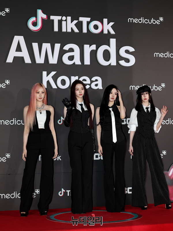 걸그룹 에스파가 15일 오후 서울 동대문구 경희대학교 평화의 전당에서 열린 '틱톡 어워즈 코리아' 레드카펫행사에서 포즈를 취하고 있다.