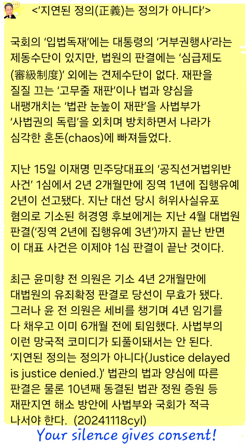 《지연된 정의(正義)는 정의가 아니다》국회의 《입법독재》에는 대통령의 《거부권행사》라는 제동수단이 있지만,법원의 판결에는 《심급제도(審級制度)》 외에는 견제수단이 없다.재판을 질질 끄는《고무줄 재판》이나법과 양심을 내팽개치는《법관 눈높이 재판》을사법부가《사법권 독립》을 외치며 방치하면서나라가 심각한 혼돈(chaos)에 빠져들었다.지난 15일 이재명 민주당대표의《공직선거법위반 사건》1심에서2년 2개월만에 징역 1년에 집행유예 2년이선고됐다.지난 대선 당시 허위사실유포 혐의로 기소된허경영 후보에게는지난 4월 대법원판결(징역 2년에 집행유예 3년)까지 끝난 반면,이 대표 사건은 이제야 1심 판결이 끝난 것이다.최근 윤미향 전 의원은 기소 4년 2개월만에대법원의 유죄확정 판결로 당선이 무효가 됐다.그러나 윤 전 의원은세비를 챙기며 4년 임기를 다 채우고이미 6개월 전에 퇴임했다.사법부의 이런 망국적 코미디가되풀이돼서는 안 된다.《지연된 정의는 정의가 아니다(Justice delayed is justice denied)》.법관의 법과 양심에 따른 판결은 물론10년째 동결된 법관 정원 증원 등재판지연 해소 방안에사법부와 국회가 적극 나서야 한다.