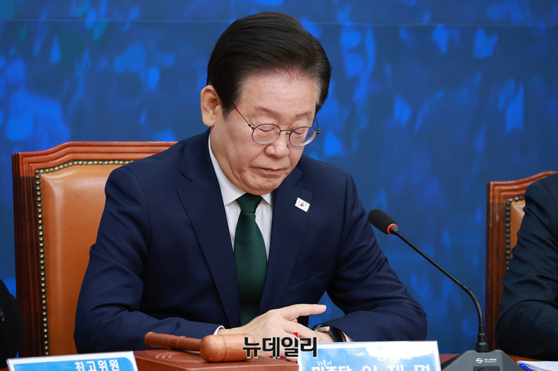 이재명 더불어민주당 대표가 18일 오전 국회 당대표실에서 열린 최고위원회의에 참석해 본인의 무죄를 주장하는 최고위원들의 발언을 굳은 얼굴로 듣고 있다.