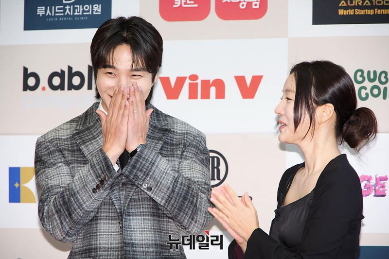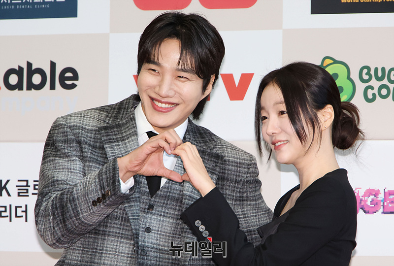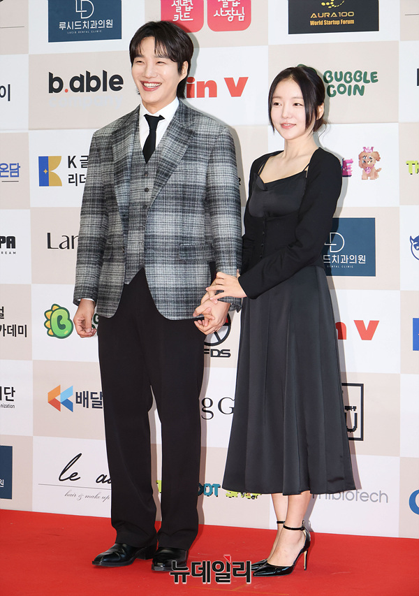 개그맨 겸 배우 김기리와 문지인 부부가 18일 오후 서울 강남구 건설회관에서 열린 '제44회 황금 촬영상 시상식' 레드카펫에서 포즈를 취하고 있다.