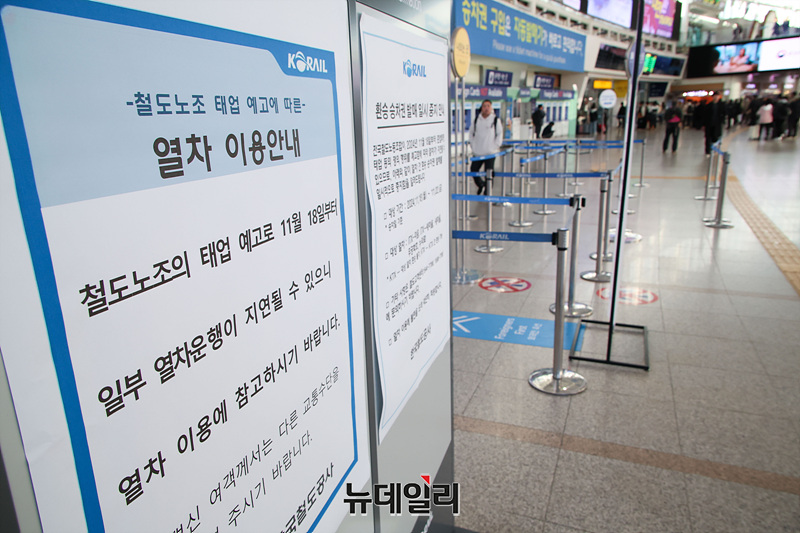 민노총 공공운수노조 전국철도노동조합(철도노조)이 준법투쟁에 들어가며 수도권 전철 1·3·4호선과 수인분당선, 경의중앙선, 서해선 등을 운행하는 수도권 전동열차가 지연 운행중인 가운데 19일 오전 서울역에 관련 안내문이 붙어 있다.