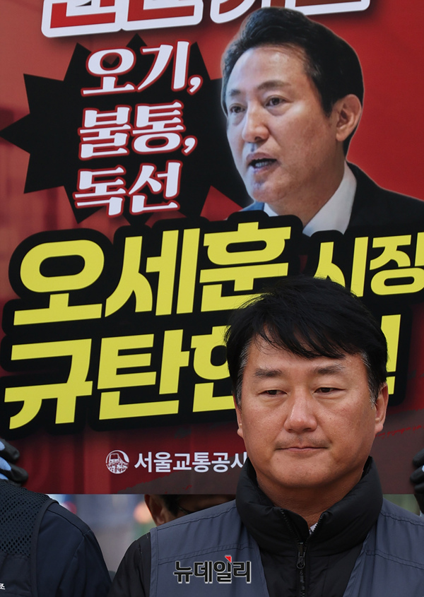 양경수 민노총 위원장이 19일 오전 서울시청 앞에서 열린 서울교통공사노조 쟁의행위 찬반투표 결과 및 투쟁방침을 발표 기자회견에 참석해 자리하고 있다. 노조측은 '1인 승무제 도입 철회' 등을 요구하며, 요구 묵살시 12월 6일 총파업을 예고했다.