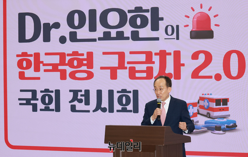 추경호 국민의힘 원내대표가 19일 오전 국회 의원회관에서 열린 'Dr.인요한의 한국형 구급차 2.0 국회 전시회'에 참석해 축사를 하고 있다.