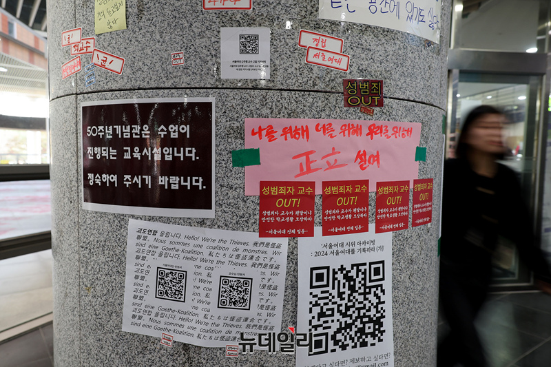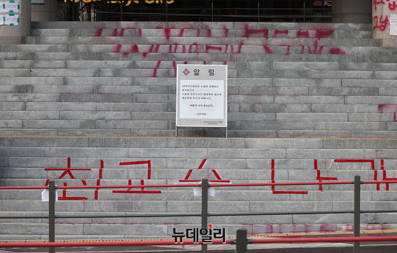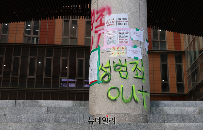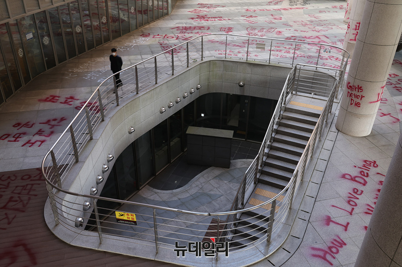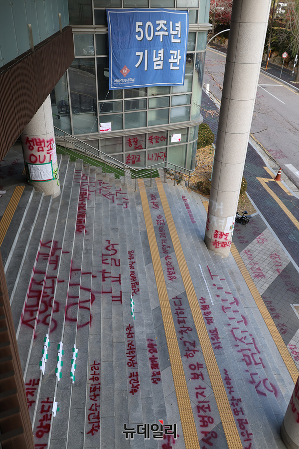 서울여대 50주년 기념관이 19일 오후 학생들이 뿌려 놓은 래커와 전단지로 몸살을 앓고 있다. 학생들은 지난해 인문대학 소속 A교수가 학생들을 대상으로 한 성추행 의혹과 관련해 추가 징계와 사퇴를 요구하며 학교 곳곳에 래커로 낙서를 했다.서울여대 총장은 학교 게시판에 "본교 건물 등 전체 시설물을 포함한 본교 재산을 훼손하여 그에 따른 비용이 발생할 경우 관련 법령 및 본교 제 규정에 근거하여 이에 상응한 인적·물적 등 책임을 묻고 손해배상을 청구할 예정이다"고 경고문을 올렸다.