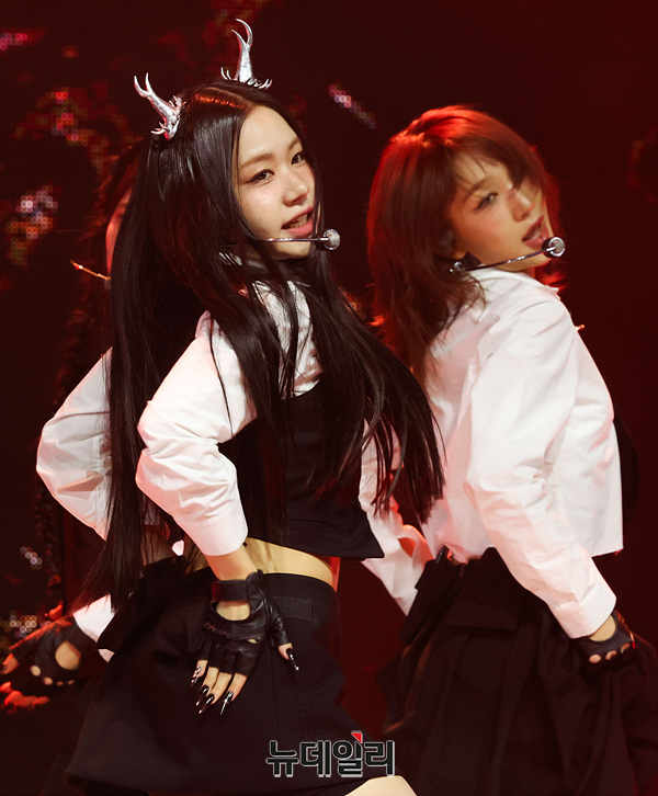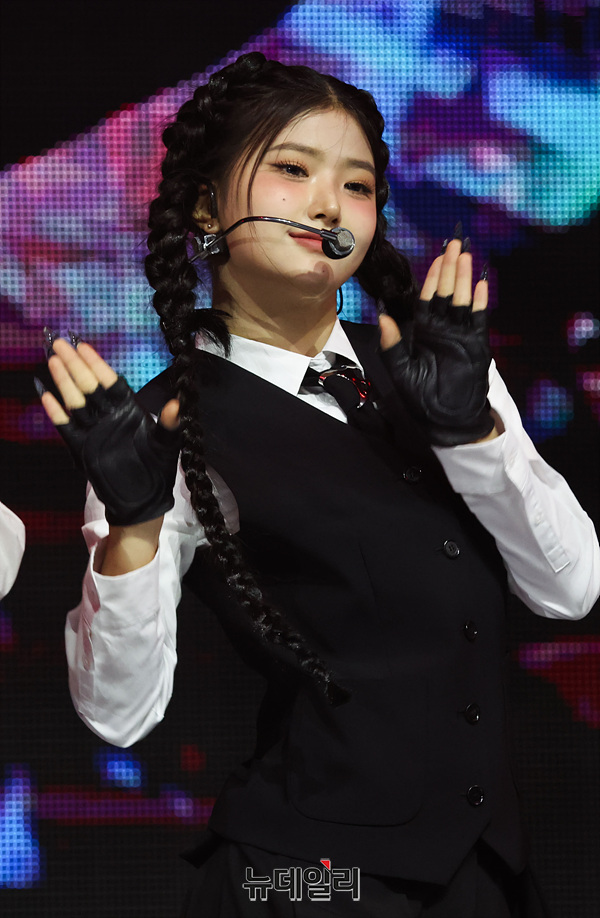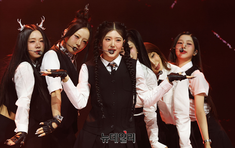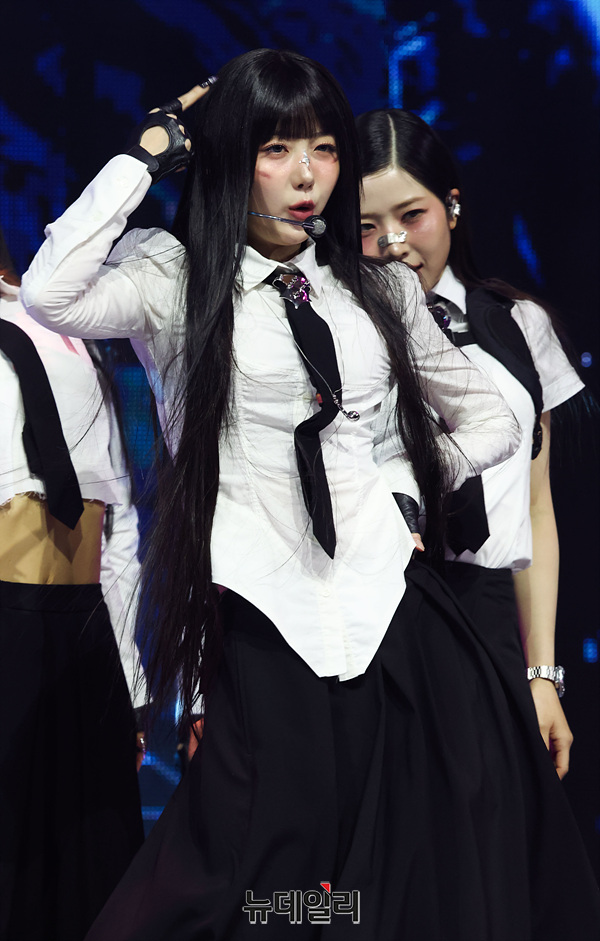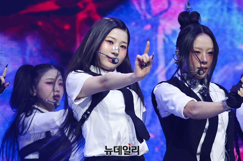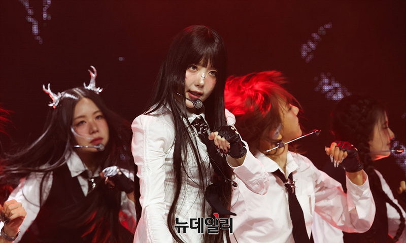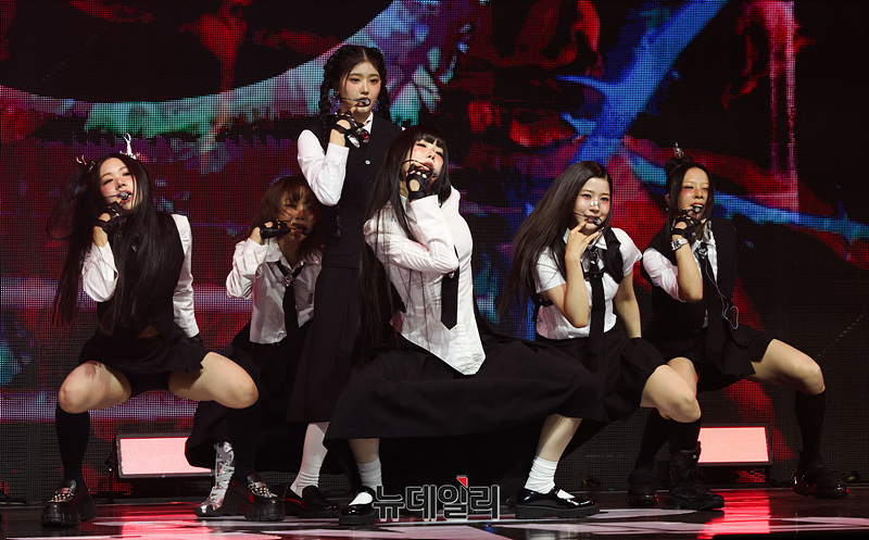 걸그룹 배드빌런(BADVILLAIN) 클로이 영, 켈리, 엠마, 빈, 윤서, 이나, 휴이가 19일 오후 서울 광진구 예스24 라이브홀에서 열린 싱글 1집 '숨(ZOOM)' 발매 기념 미디어 쇼케이스에서 무대를 선보이고 있다.