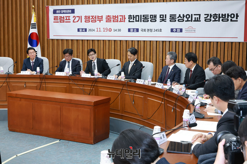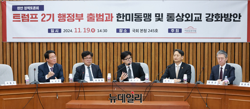 한동훈 국민의힘 대표가 19일 오후 국회에서 여의도연구원 주최로 열린 트럼프 2기 행정부 출범과 한미동맹 및 통상외교 강화 방안 긴급 정책토론회에서 축사를 하고 있다.