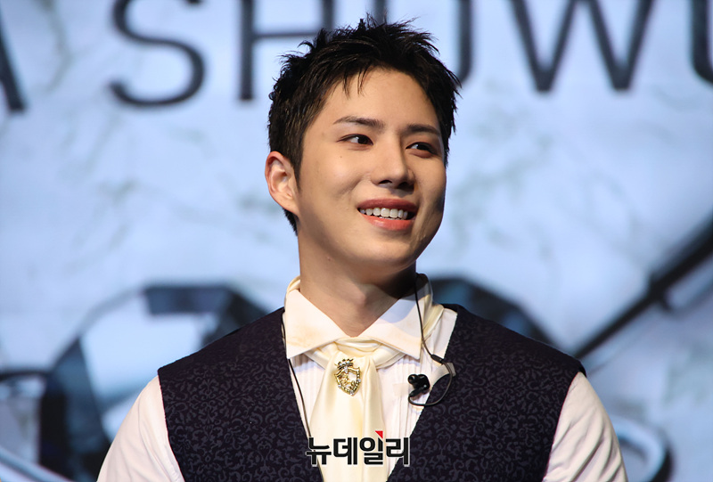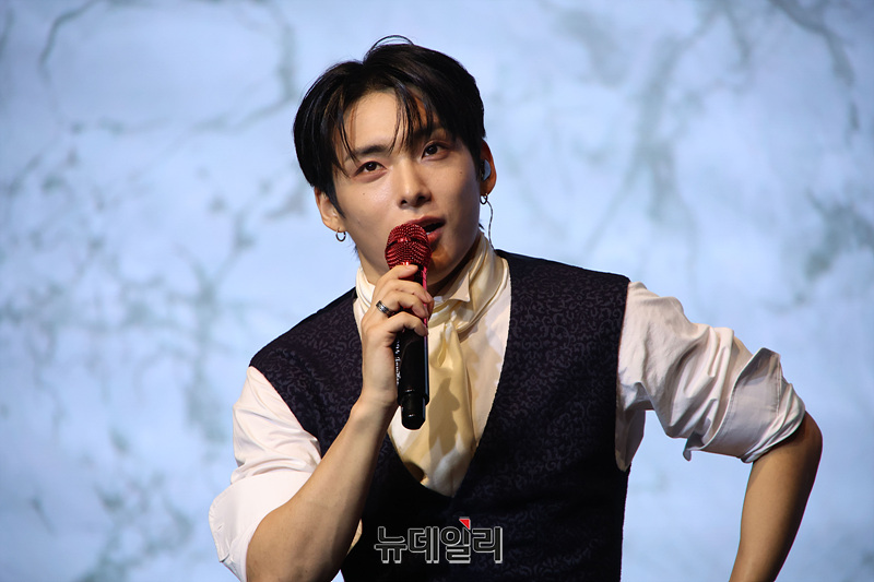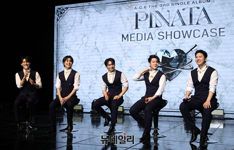 그룹 에이스(A.C.E) 강유찬, 이동훈, 박준희, 김병관, 와우가 20일 오후 서울 강남구 일지아트홀에서 열린 싱글3집 '피냐타(PINATA)' 발매 기념 쇼케이스에서 소감을 밝히고 있다.