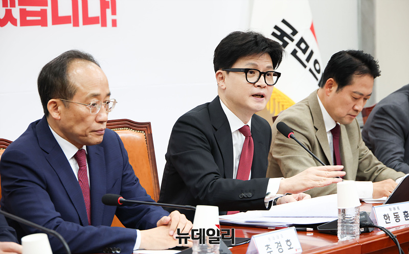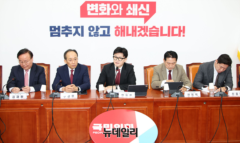 한동훈 국민의힘 대표가 21일 오전 서울 여의도 국회에서 열린 최고위원회의에서 모두발언을 하고 있다.