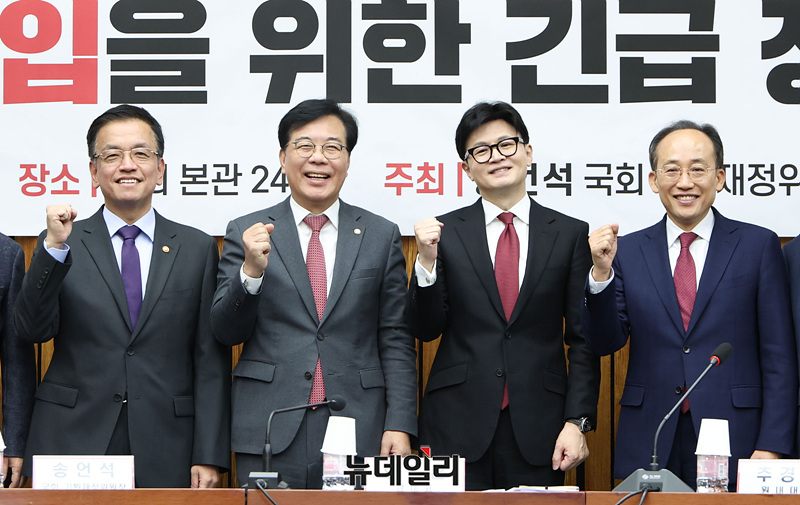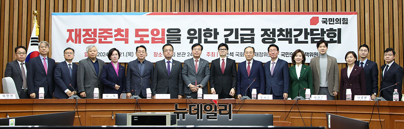 한동훈 국민의힘 대표, 추경호 원내대표, 송언석 국회 기획재정위원장, 최상목 경제부총리 겸 기획재정부 장관을 비롯한 참석자들이 21일 오전 서울 여의도 국회에서 열린 '재정준칙 도입을 위한 긴급 정책간담회'에서 기념촬영을 하고 있다.