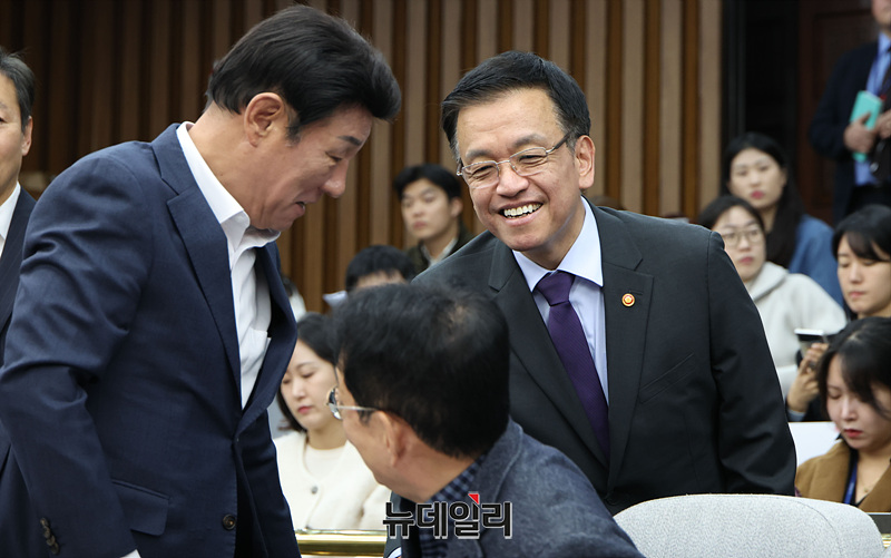 최상목 경제부총리 겸 기획재정부 장관이 21일 오전 서울 여의도 국회에서 열린 '재정준칙 도입을 위한 긴급 정책간담회'에 참석하며 인사를 나누고 있다.