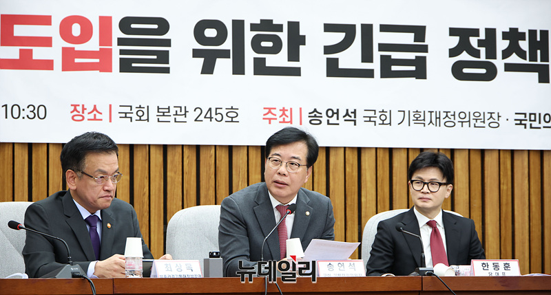 송언석 국회 기획재정위원회 위원장이 21일 오전 서울 여의도 국회에서 열린 '재정준칙 도입을 위한 긴급 정책간담회'에서 발언하고 있다.
