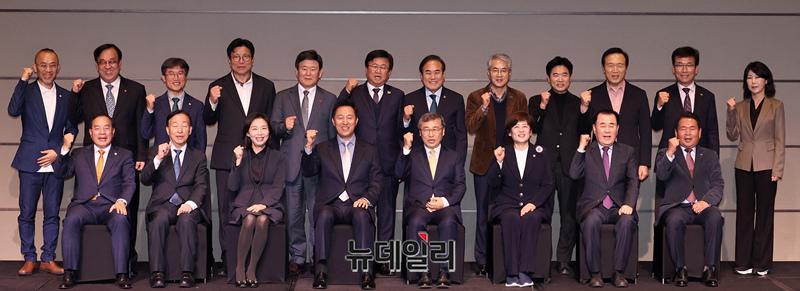 제100회 전국 시·도교육감협의회 총회가 21일 오후 서울 용산구 그랜드 하얏트 호텔에서 열린 가운데 참석자들이 기념촬영을 하고 있다.