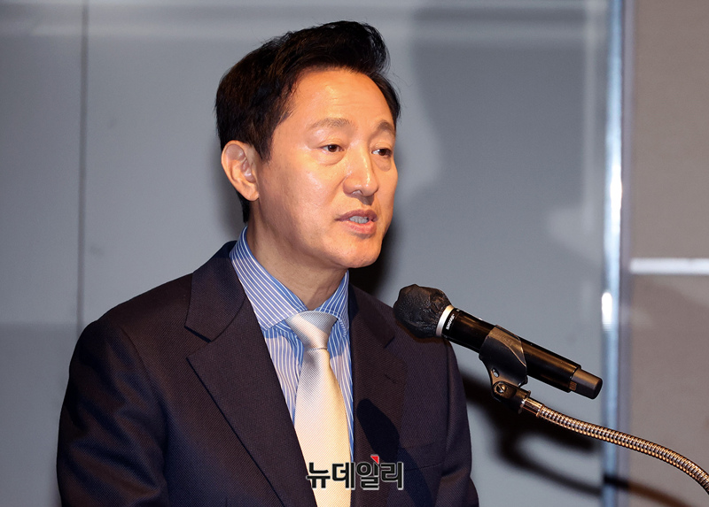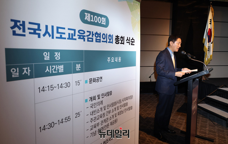 오세훈 서울시장이 21일 오후 서울 용산구 그랜드 하얏트 호텔에서 열린 제100회 전국 시·도교육감협의회 총회에서 인사말을 하고 있다.