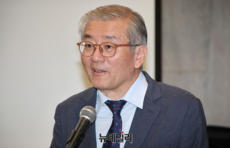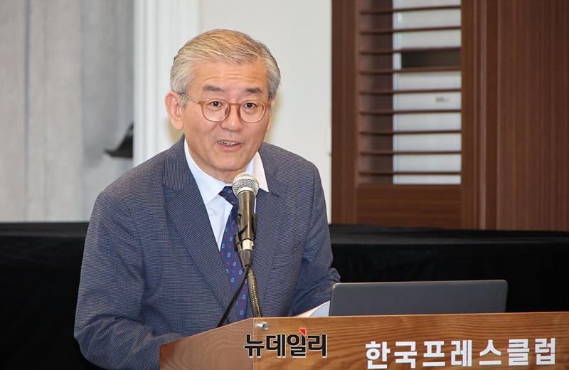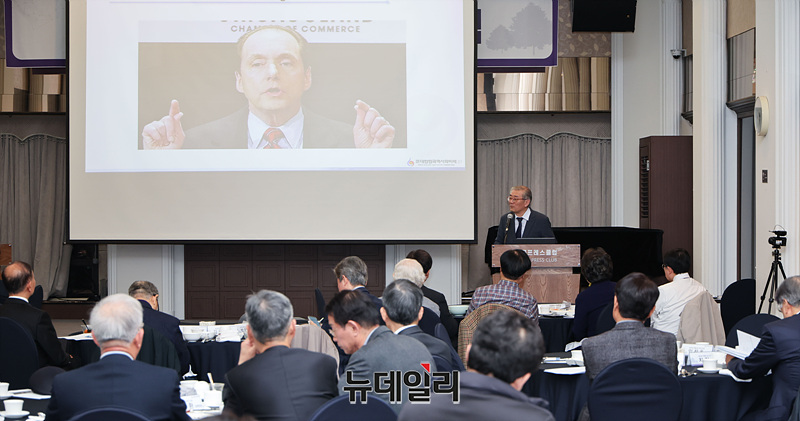 김형진 전 EU 대사가 21일 오후 서울 중구 한국프레스센터에서 '안보와 외교'를 주제로 열린 '제18차 지혜의 숲 100인 포럼'에서 '미국 대선결과가 우리나라에 미칠 영향'을 주제로 강연하고 있다.