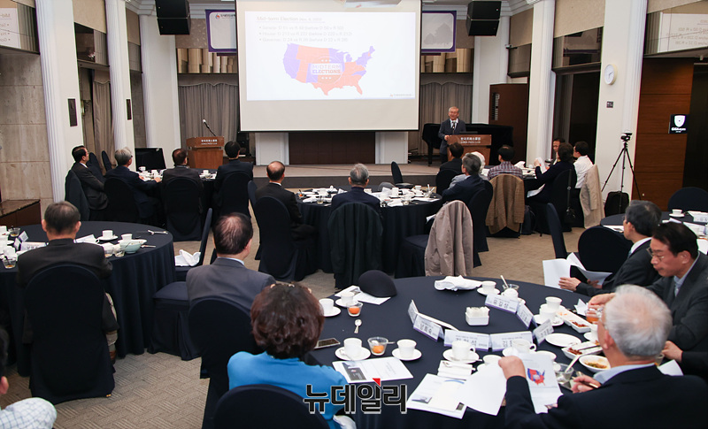 [포토] '미국 대선결과가 우리나라에 미칠 영향' 주제로 강연하는 김형진 전 EU대사
