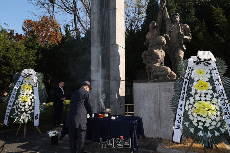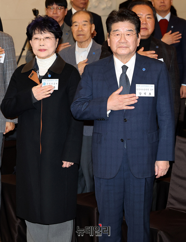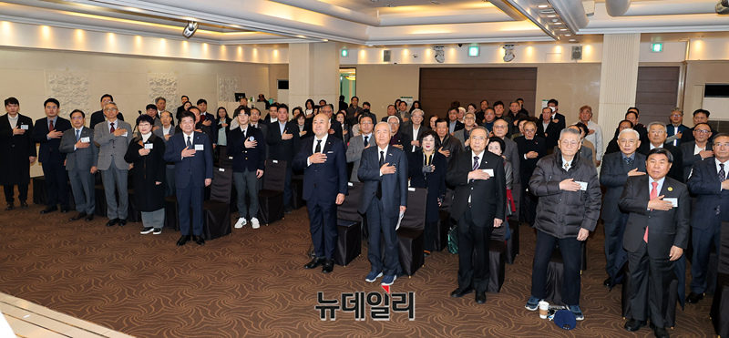 강석호 한국자유총연맹 총재, 이세웅 평북지사, 권영해 통일건국회장, 윤동진 신의주학생의거기념회장, 김형서 주니어자유연맹 경기 회원 등 참석자들이 22일 오전 서울 중구 한국자유총연맹 자유센터에서 열린 제79주년 신의주학생의거 기념식에서 국민의례를 하고 있다.'신의주 학생의거'는 1945년 11월 23일 평안북도 신의주에서 중학교 학생들이 ‘공산당 타도’를 외치며 벌인 반공 시위다.1957년 이승만 전 대통령이 '반공학생의 날'로 국가기념일을 지정했다. 1968년 박정희 전 대통령은 현재 남산 소재 한국자유총연맹 부지에 신의주학생의거기념탑을 세웠다.