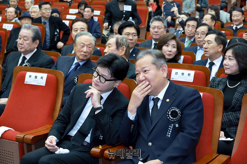 한동훈 국민의힘 대표가 22일 오전 서울 동작구 국립서울현충원에서 열린 고(故) 김영삼 전 대통령 9주기 추모식에 참석해 이상민 행정안전부 장관과 대화를 나누고 있다.