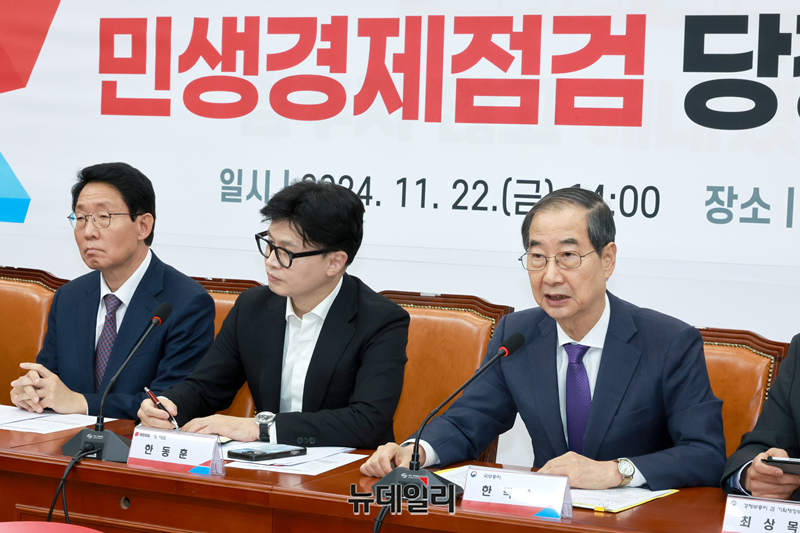 한덕수 국무총리가 22일 오후 국회에서 열린 민생경제점검 당정협의회에서 인사말을 하고 있다.