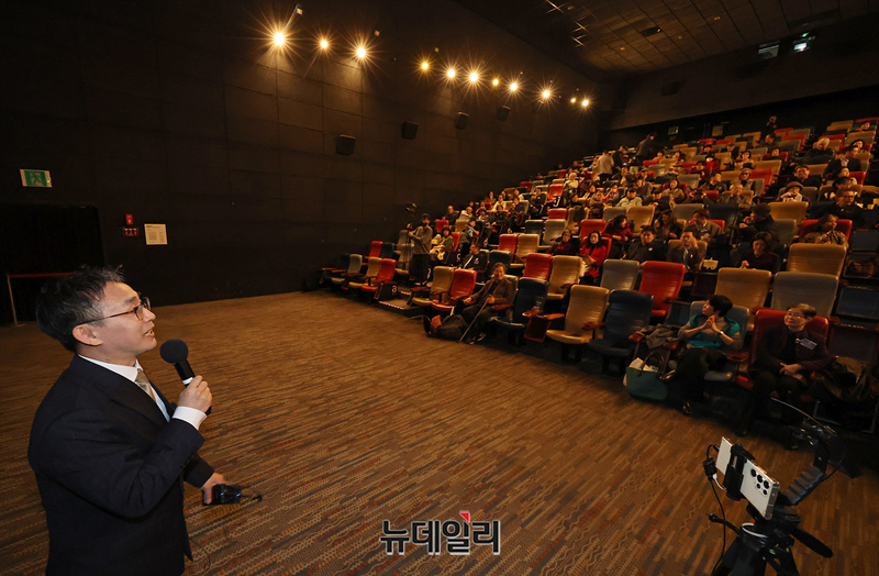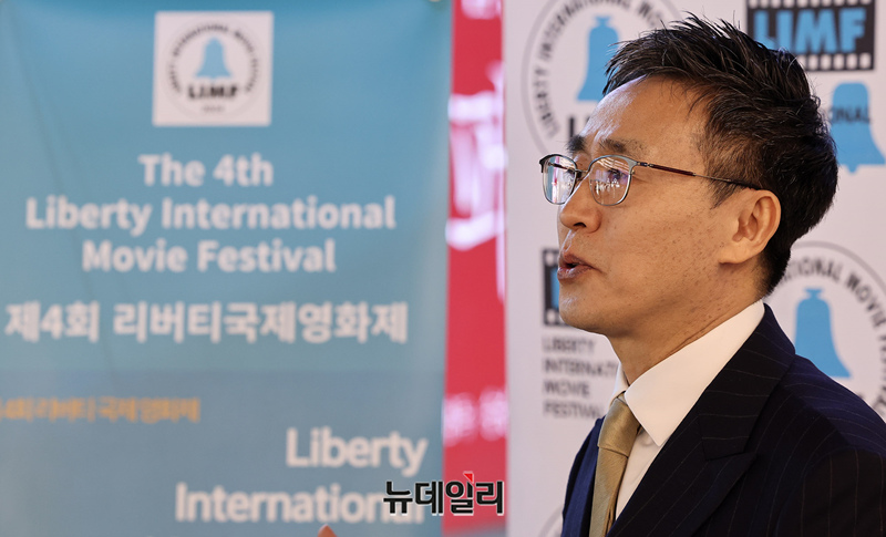 김덕영 리버티국제영화제 집행위원장이 22일 오후 서울 강남구 메가박스 코엑스에서 열린 제4회 리버티 국제영화제에서 인사말을 하고 있다.