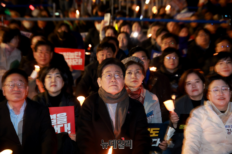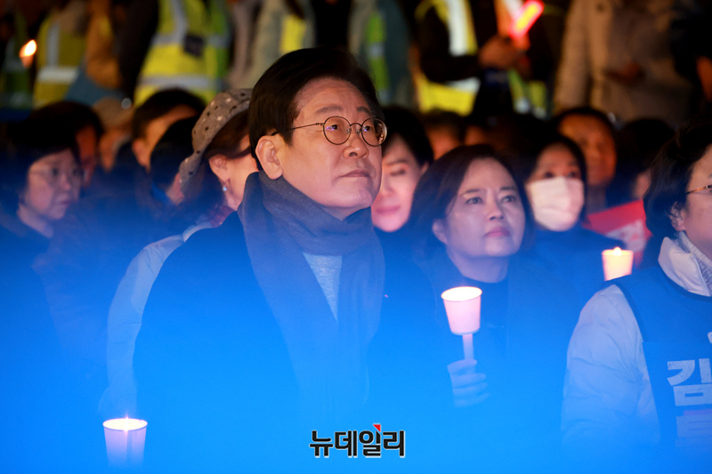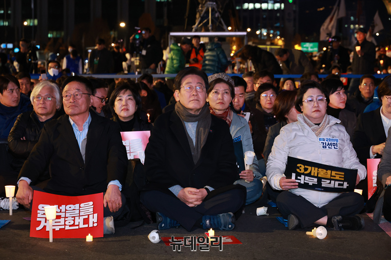이재명 더불어민주당 대표가 23일 서울 광화문광장 인근에서 열린 '김건희·윤석열 국정농단 규탄·특검 촉구 제4차 국민행동의 날'집회에 참석해 앉아 있다.
