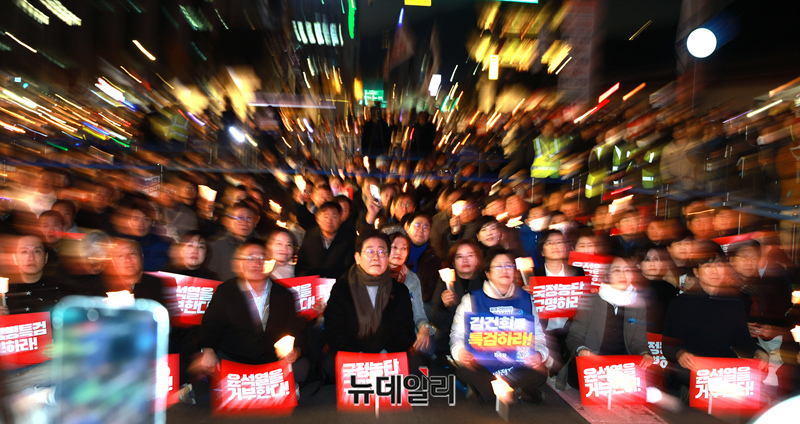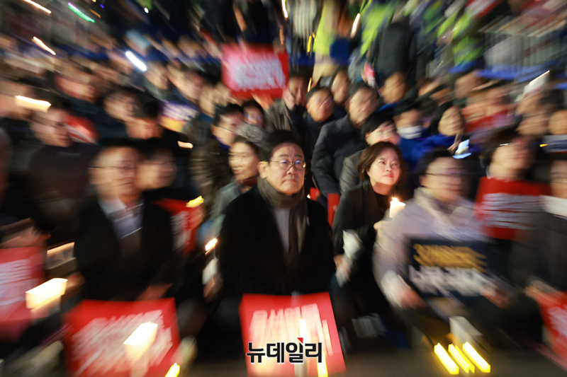 이재명 더불어민주당 대표가 23일 서울 광화문광장 인근에서 열린 '김건희·윤석열 국정농단 규탄·특검 촉구 제4차 국민행동의 날'집회에 참석해 앉아 있다.