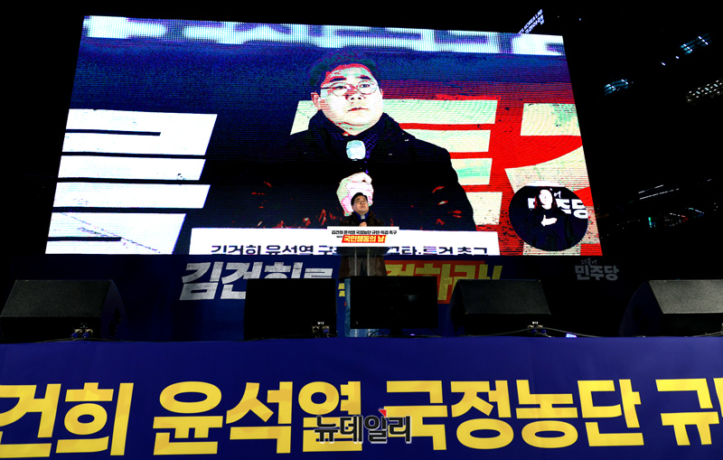 박찬대 더불어민주당 원내대표가 23일 서울 광화문광장 앞 도로에서 열린 '김건희·윤석열 국정농단 규탄·특검 촉구 제4차 국민행동의 날'집회에 참석해 발언을 하고 있다.