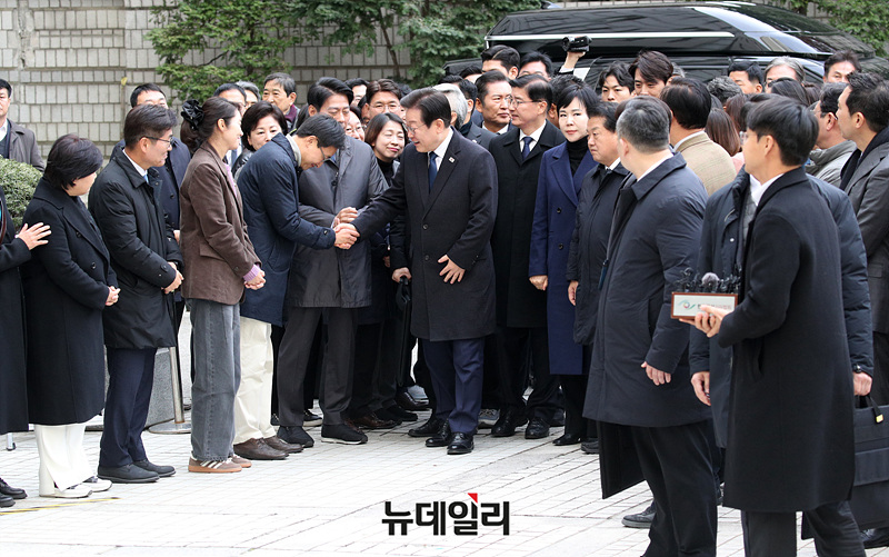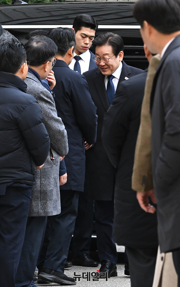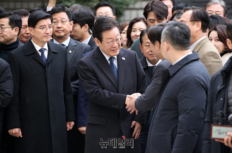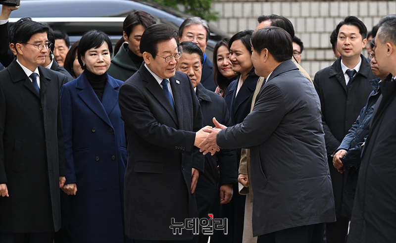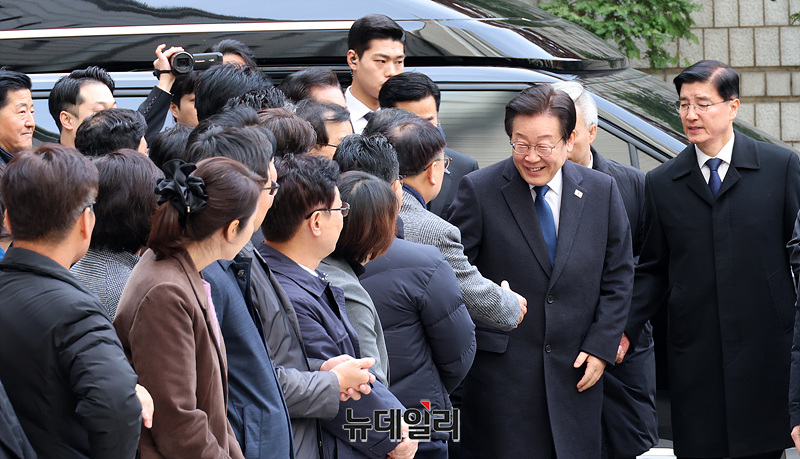 이재명 더불어민주당 대표가 25일 오후 서울 서초구 서울중앙지법에서 열린 '위증교사' 관련 1심 선고공판에 출석하며 인사를 나누고 있다. (사진=공동취재단)