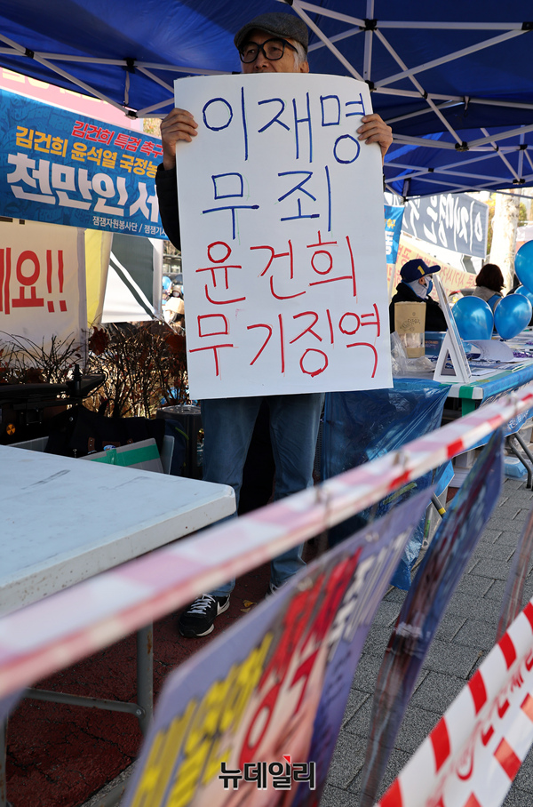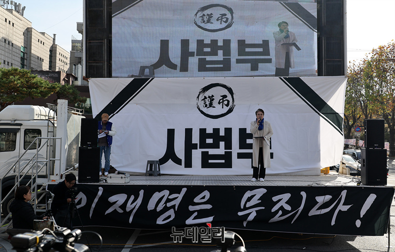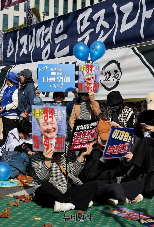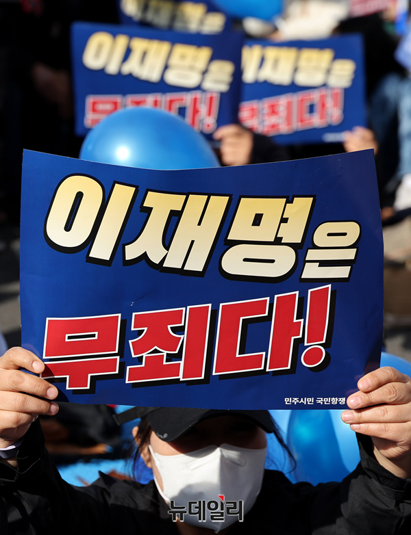 이재명 더불어민주당 대표의 위증교사 혐의 사건의 1심 선고를 앞둔 25일 오후 서울 서초구 서울중앙지검 앞에서 이 대표의 지지자들이 무죄를 외치고 있다.