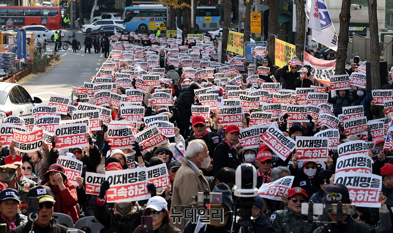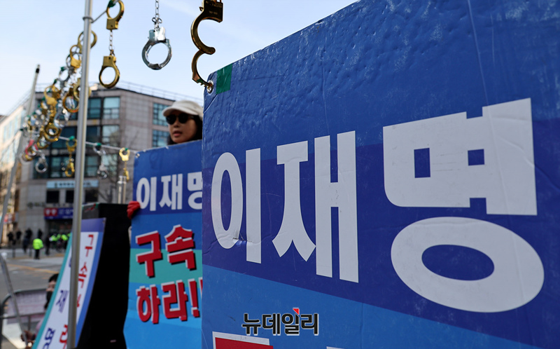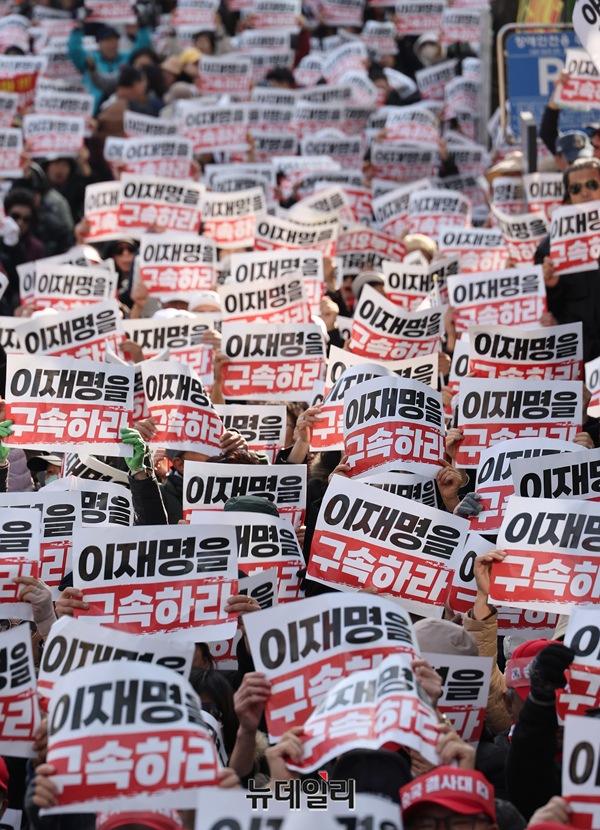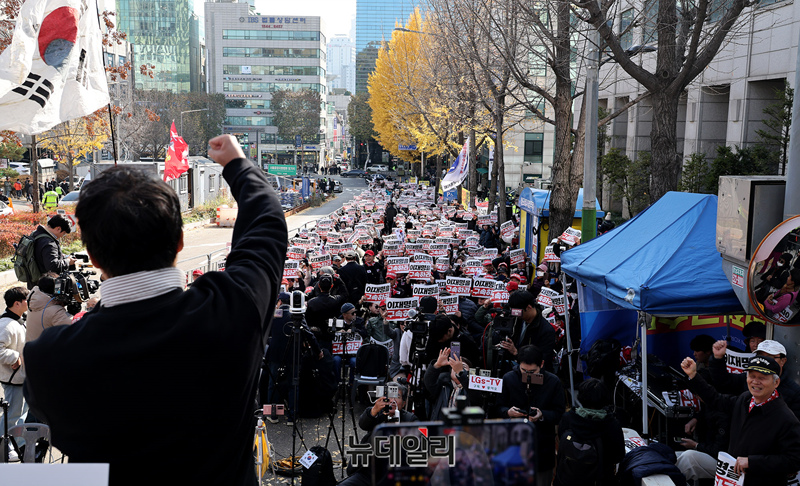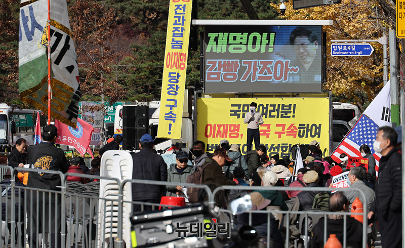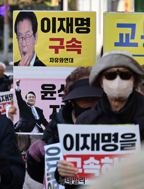 이재명 더불어민주당 대표의 위증교사 혐의 사건의 1심 선고를 앞둔 25일 오후 서울 서초구 서울중앙지법 앞에서 이 대표의 구속수사를 촉구하고 있다.