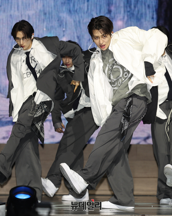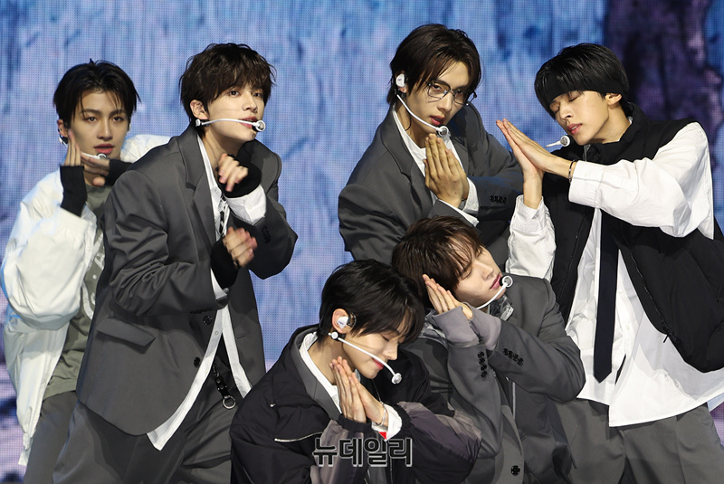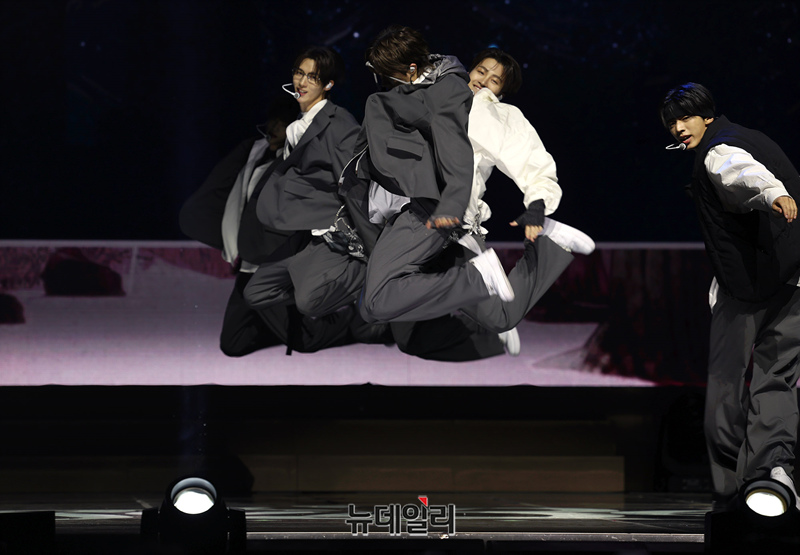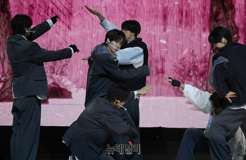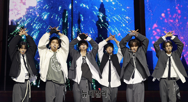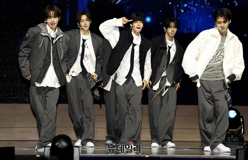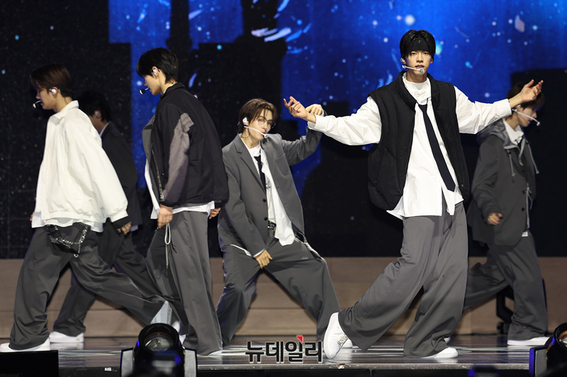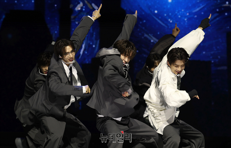 아이돌그룹 투어스(TWS)가 25일 오후 서울 용산구 블루스퀘어에서 열린 싱글 1집앨범 'Last Bell(라스트 벨)' 쇼케이스에서 '마지막 축제' 무대를 선보이고 있다.