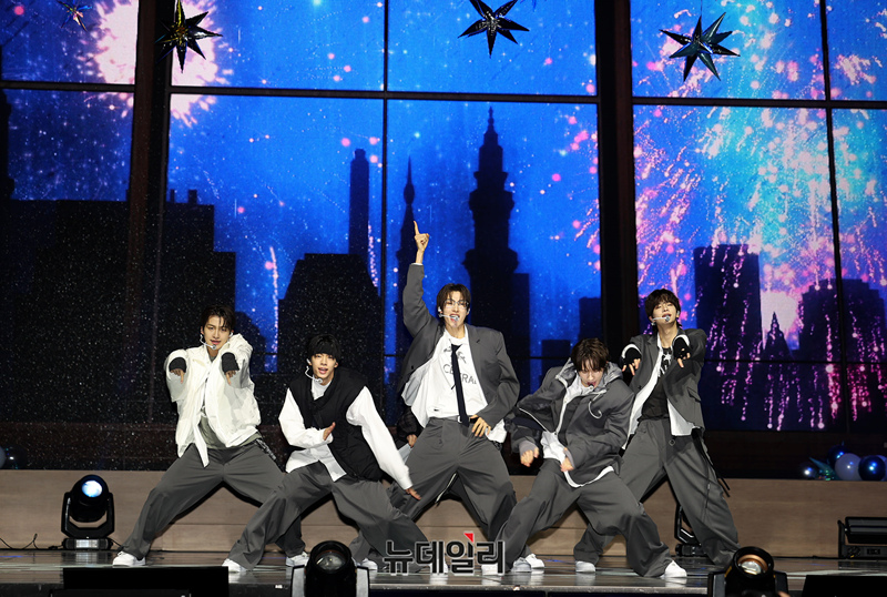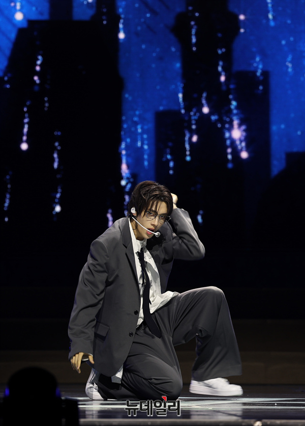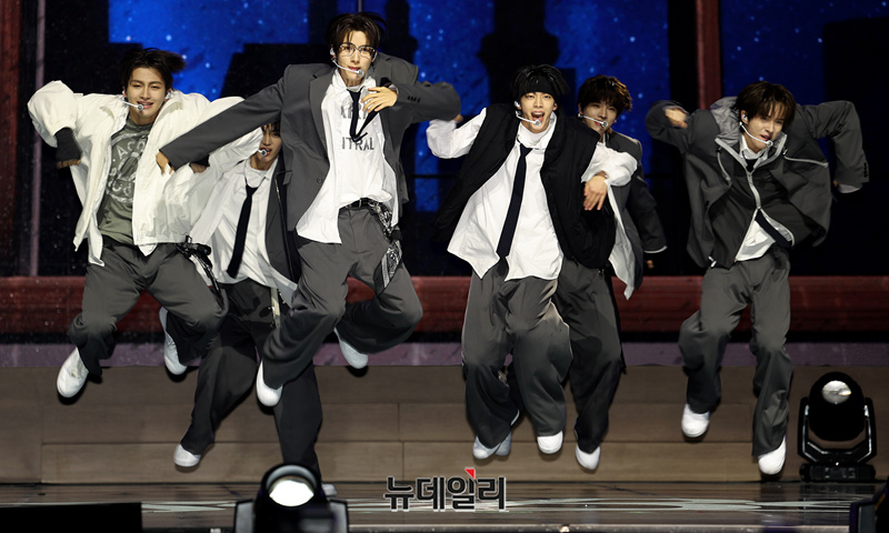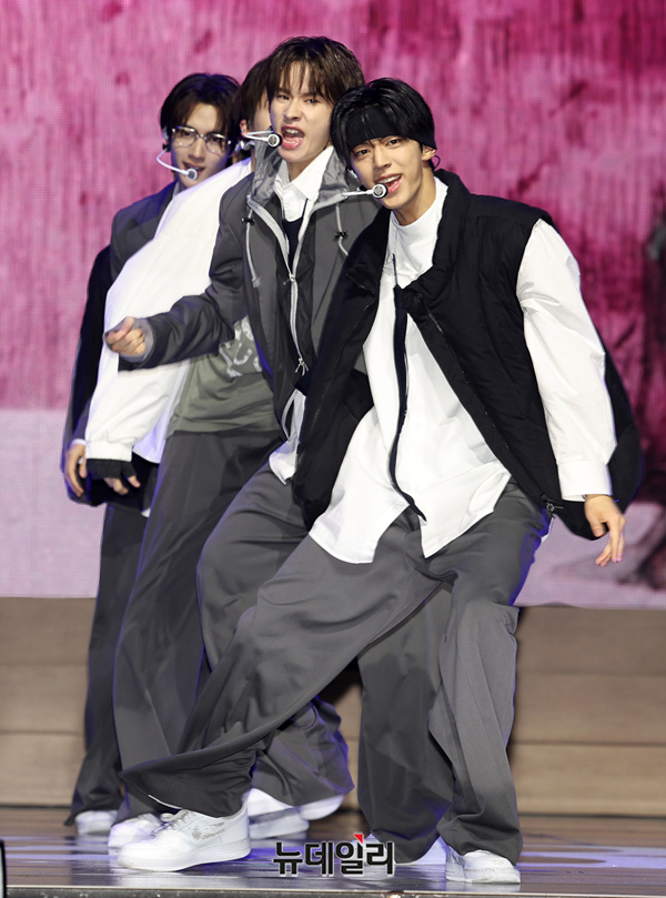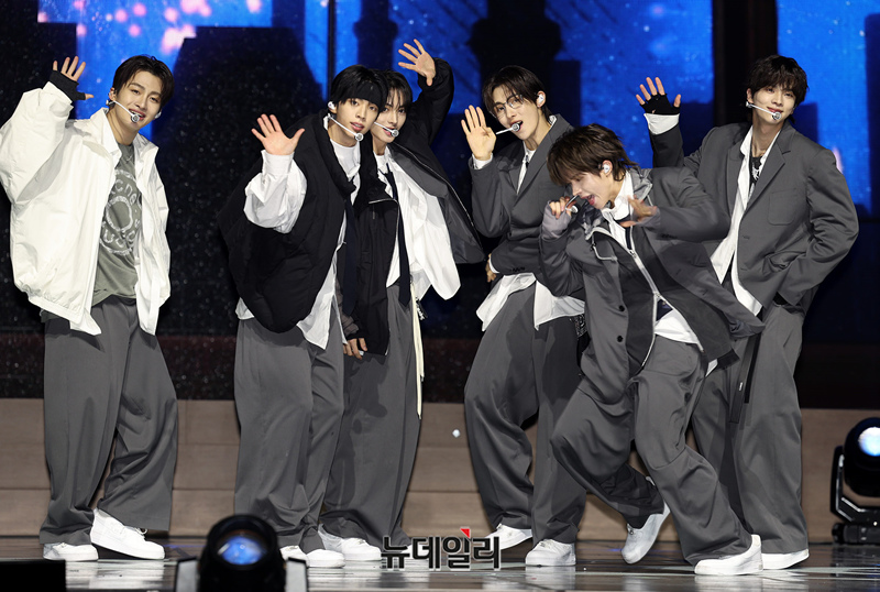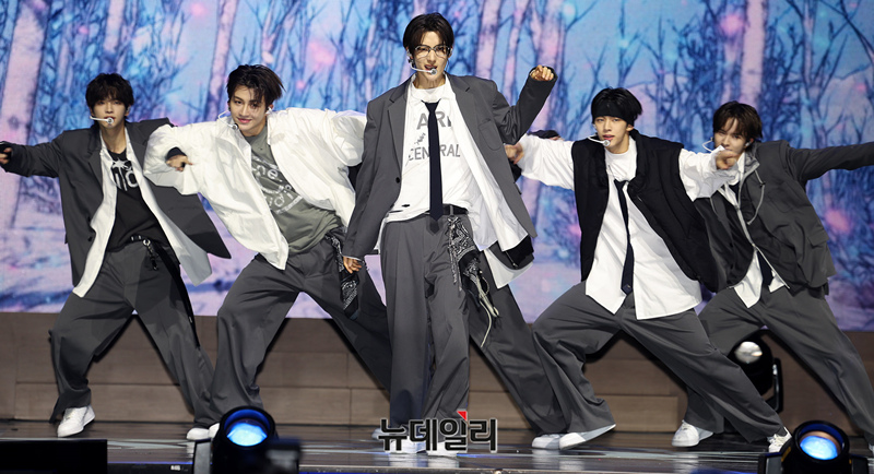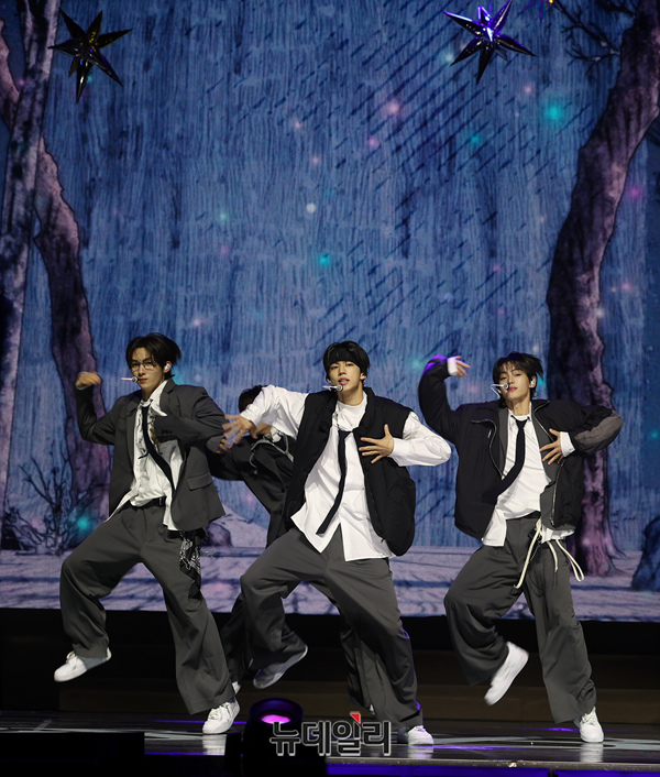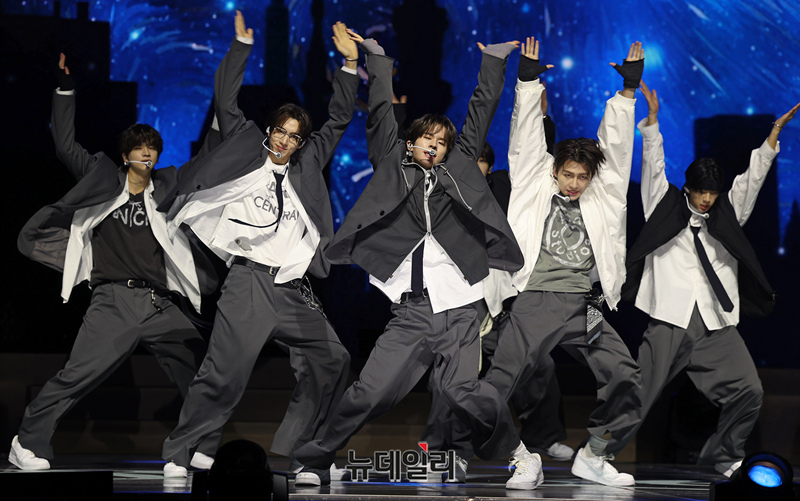 아이돌그룹 투어스(TWS)가 25일 오후 서울 용산구 블루스퀘어에서 열린 싱글 1집앨범 'Last Bell(라스트 벨)' 쇼케이스에서 '마지막 축제' 무대를 선보이고 있다.