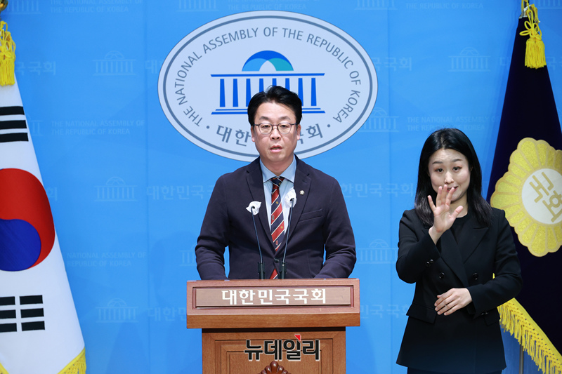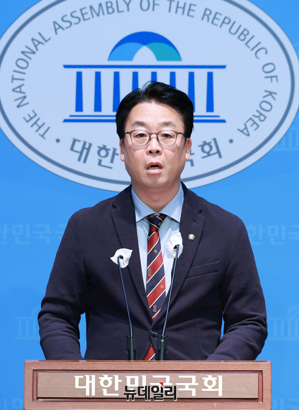 곽규택 국민의힘 수석대변인 25일 오후 국회 소통관에서 이재명 더불어민주당 대표 선고 관련 구두논평을 하고 있다.