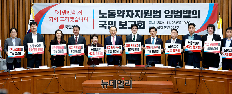 한동훈 국민의힘 대표, 추경호 원내대표, 김문수 고용노동부 장관이 26일 국회에서 열린 노동약자지원법 입법발의 국민 보고회에서 참석자들과 손피켓을 들고 기념촬영을 하고 있다.