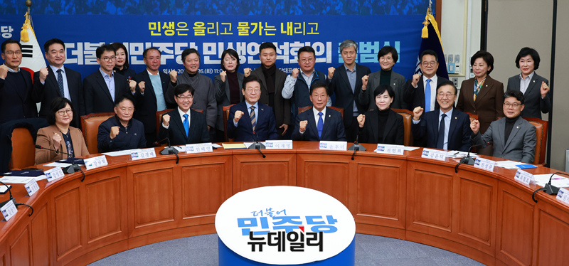 이재명 더불어민주당 대표와 윤후덕 의원 등 참석자들이 26일 국회에서 열린 민생연석회의 출범식에서 기념촬영을 하고 있다.
