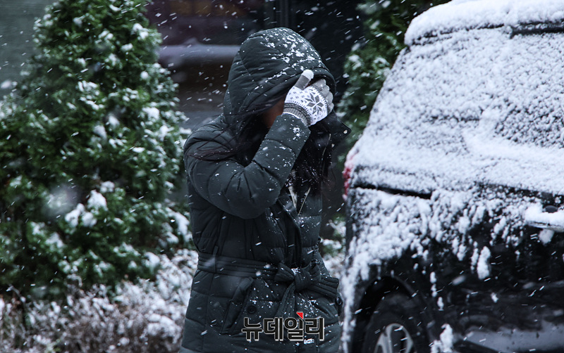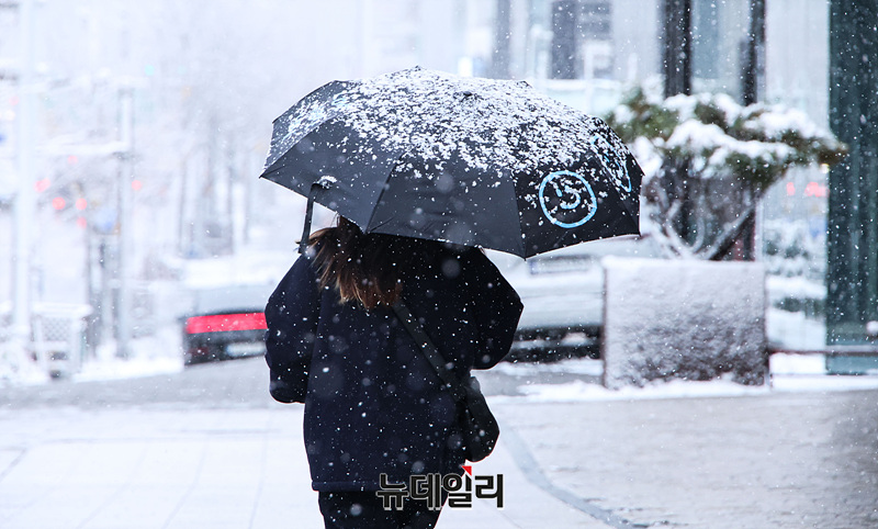 수도권과 강원지역을 중심으로 대설특보가 발효된 27일 오전 서울 강남구 도산대로에서 시민들이 눈을 피하며 발걸음을 재촉하고 있다.