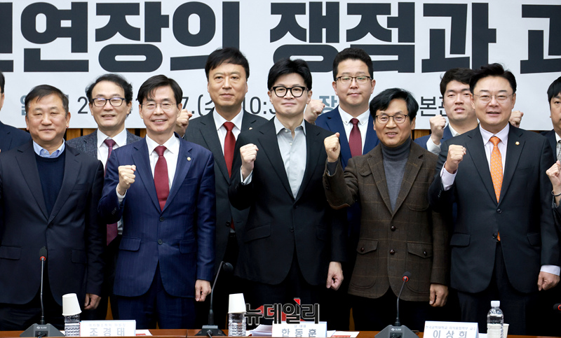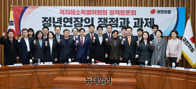 한동훈 국민의힘 대표와 조경태 격차해소특별위원장 및 참석자들이 27일 국회에서 '정년연장의 쟁점과 과제'란 주제로 열린 격차해소특별위원회 정책토론회에 참석해 기념촬영을 하고 있다.